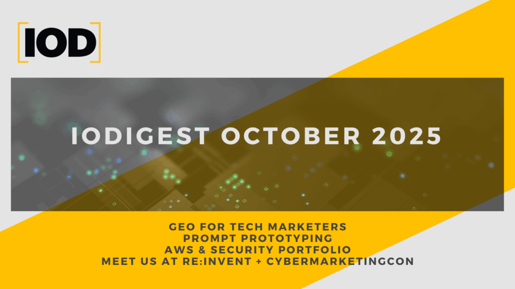 by IOD Team October 31, 2025 IODigest October 2025: GEO for Tech Marketers, Prompt Prototyping, AWS & Security Portfolio, Meet Us at re:Invent + CyberMarketingCon Read more >